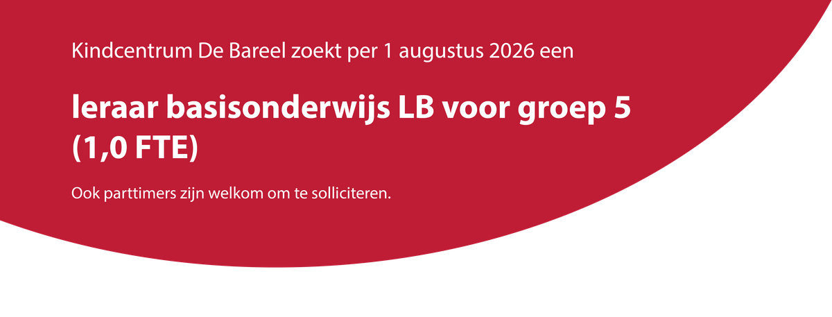 Natuurlijk krijg je daarbij alle ondersteuning van je collega’s. Op De Bareel denken wij in mogelijkheden en sluiten we aan bij jouw ontwikkeling. We zijn dan ook benieuwd waarin jij je wil ontwikkelen de komende jaren en maken graag kennis met jou. De functie is eventueel ook in te vullen door twee parttimers. Start per 1 augustus 2026.